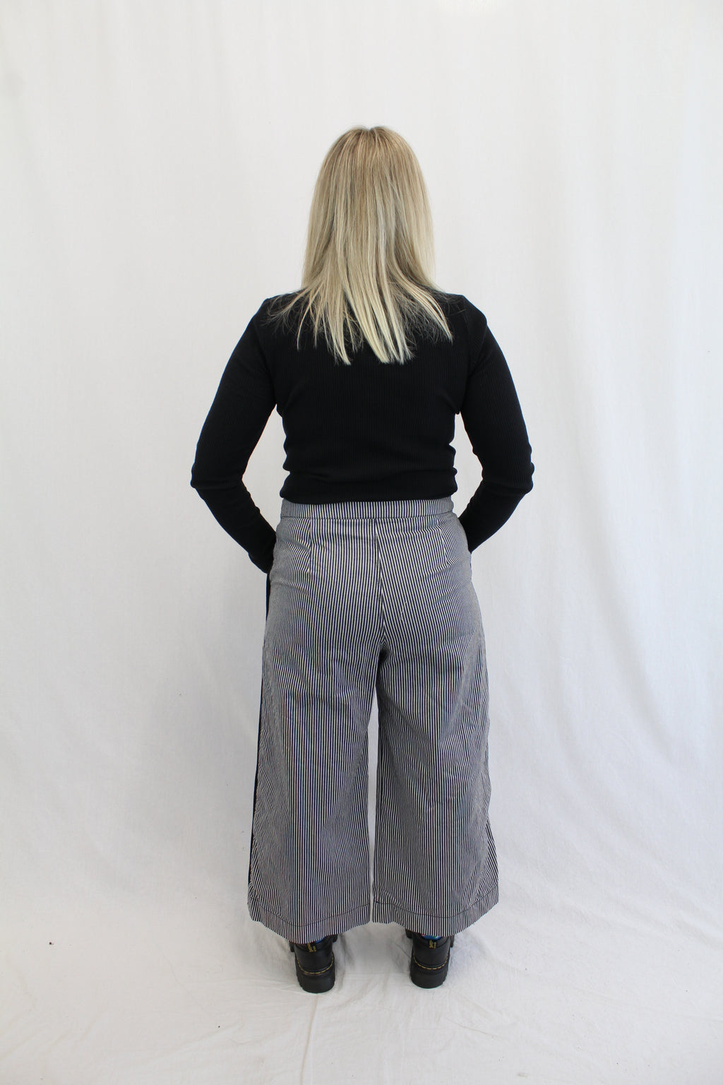 - Black panel running down leg