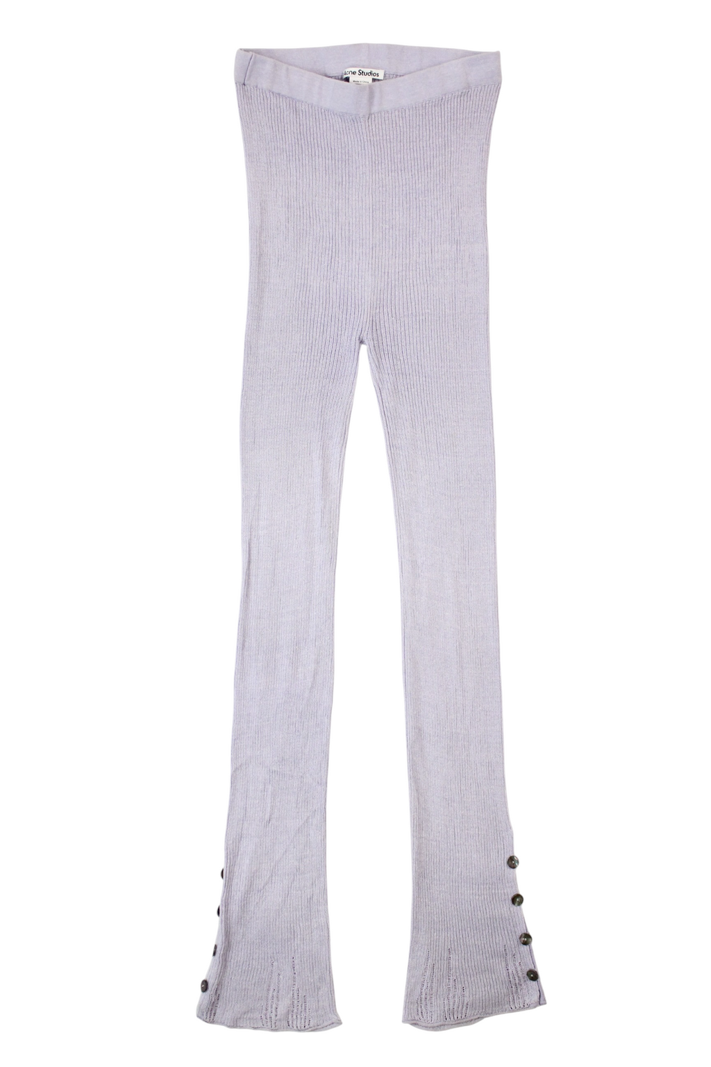- Flared hems with button and distressing details