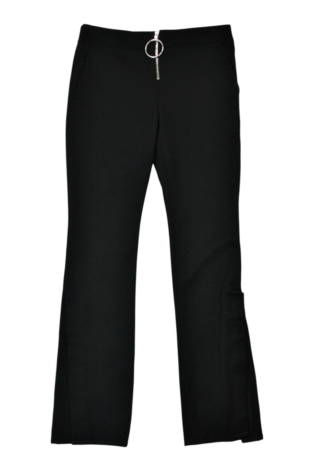 - Exposed zipper fly with large circular metal puller